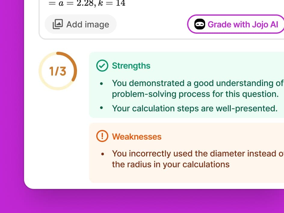 Jojo AI instantly grades your answers and diagrams, providing feedback in line with the mark scheme.